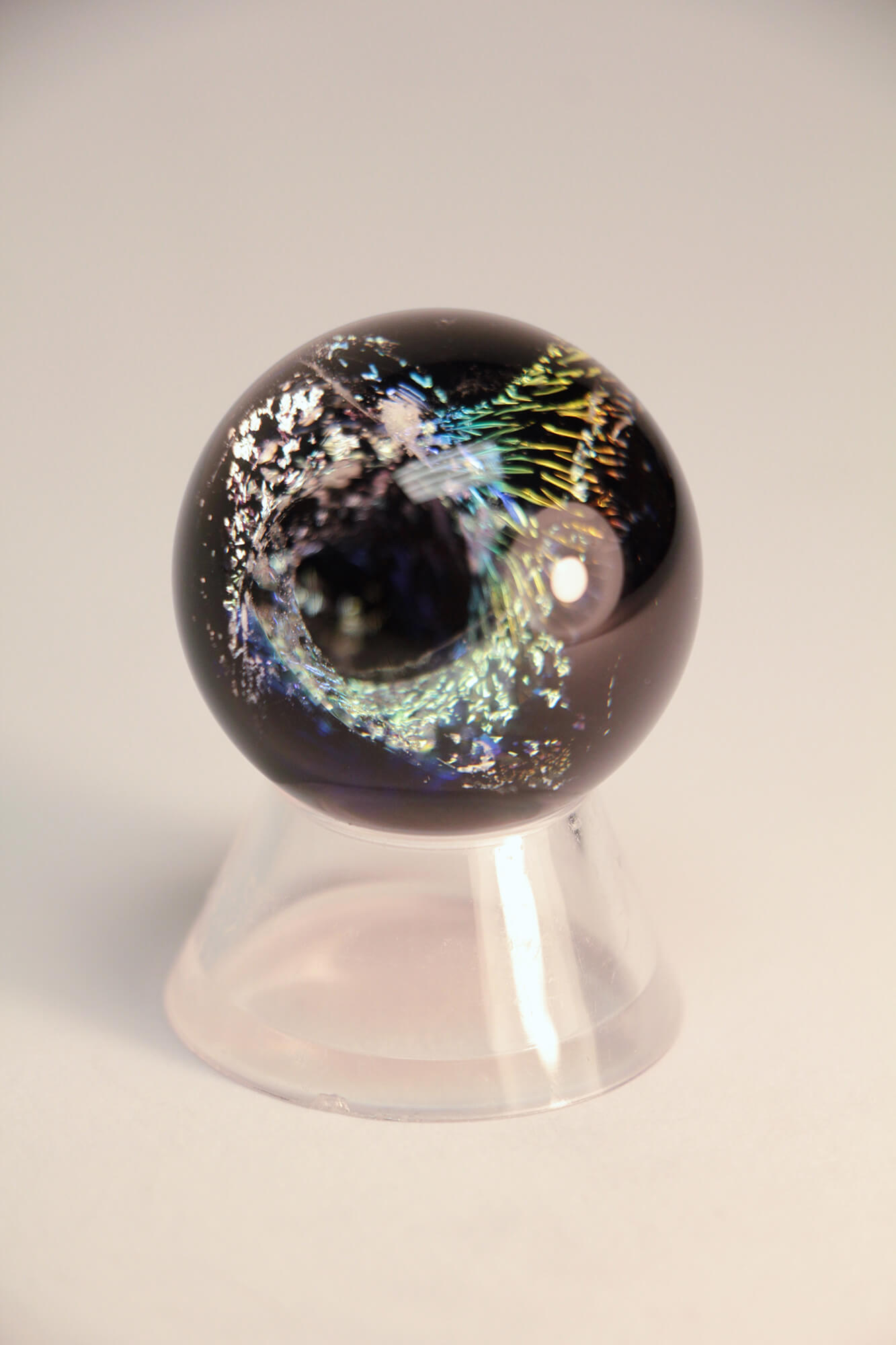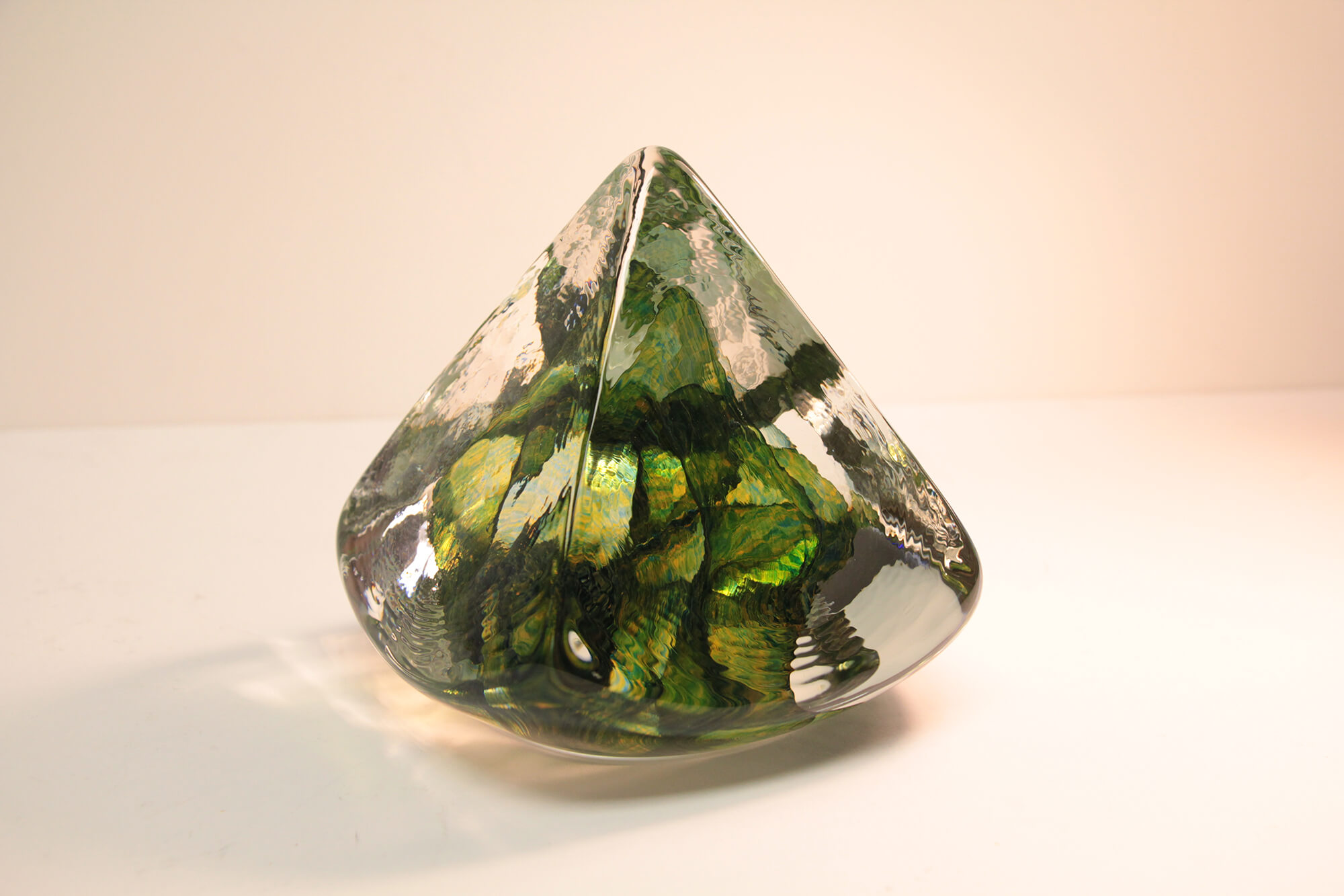 “My pieces begin as a mass of molten glass pulled into long thin rods. These rods contain a series of concentric circles built from thin layers of color and can only be seen when snipped into a bit and turned on end. Hundreds, sometimes thousands , of these cross sections are individually arranged on a kiln shelf then fired to become a dingle surface. Each piece is extensively cold worked for a satin finish and fired again for the final shaping.