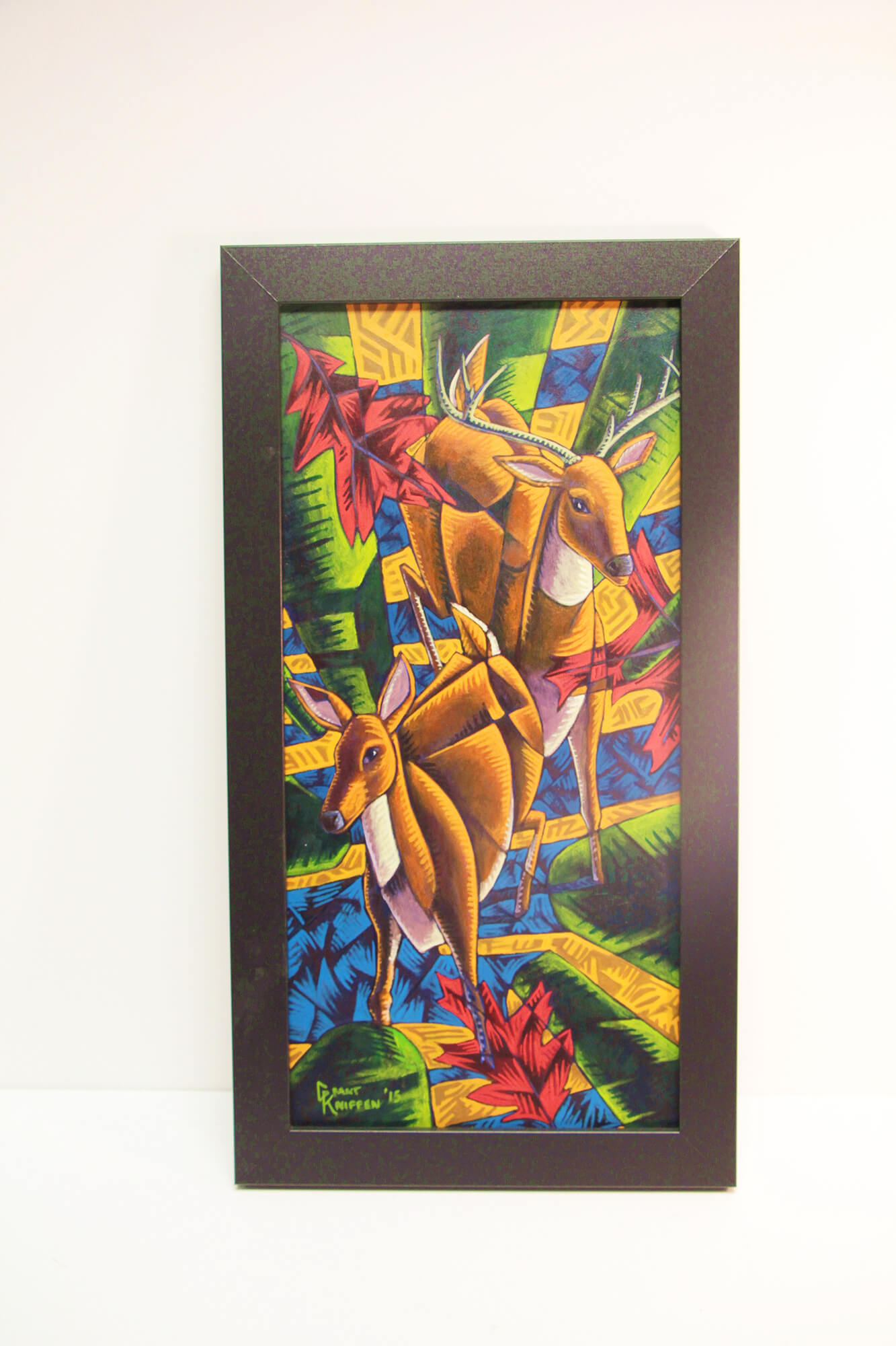 “This composition allowed me to work with a wildlife subject of two deer walking in the woods in the shadows of the trees. I was also exploring multiple perspectives. As I was painting, I was dissatisfied with how I was depicting the ground. After several layers of paint, I somehow figured out the abstract patterning to represent the fallen leaves and carried it over to the trees and figures to unify the composition.