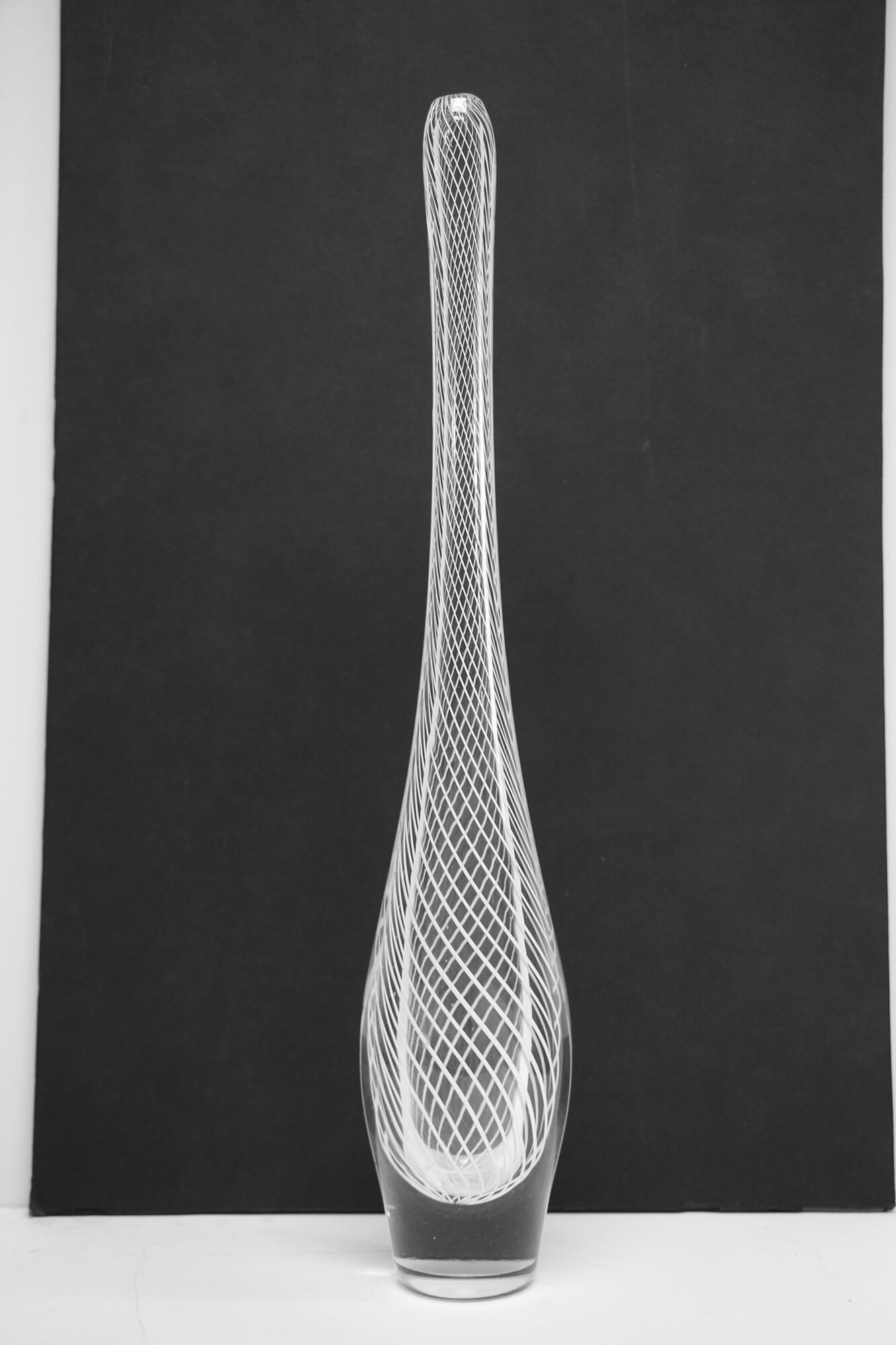 “While the glass is being shaped, it is frequently reheated in an incandescent chamber called a ‘glory hole’. Hot glass additions of a single color or hot glass rolled in chips of colored glass are applied during the blowing process. The bottom finlike appendices are added this way. The foot or base is cast from colored glass in an open steel mold; then flipped over and attached to the vase. The small blob of colored glass under the clear ball is hottest at this step and makes the joint. Then a solid steel rod coated at the one end with glass attached to the center of the foot bottom is broken free from the blow pipe. This crucial transition is called the ‘stick-up’ or ‘punty-up’. After enlarging the opening glass, ‘trails’ or ‘wraps’ are added to the opening. After opening, pinching and shearing, become the bands of color and the appendices at the top of the vase. When finished the vase is and placed in a special electric oven to cool.”