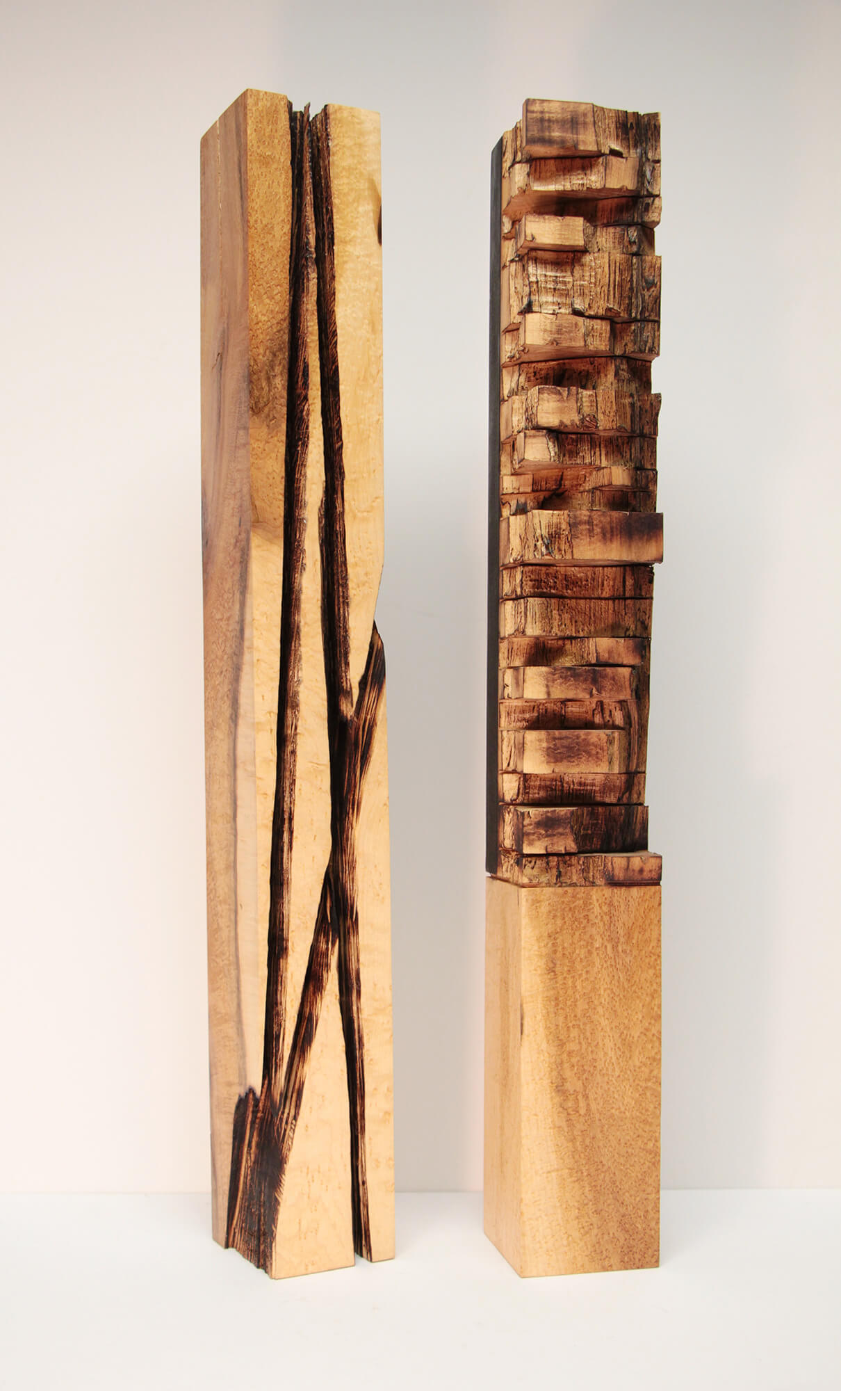 “I create carved wood panels and objects made from sawmill waste with both hand and power tools. The wood is often worked green then allowed to warp and crack as it dries. I paint or burn the surface then sand back to emphasize tool marks. The lines and textures carved in the wood are abstractions from the natural environment. I primarily work within squares, rectangles and grids; exploring relationships between the organic carving and the machined lines.