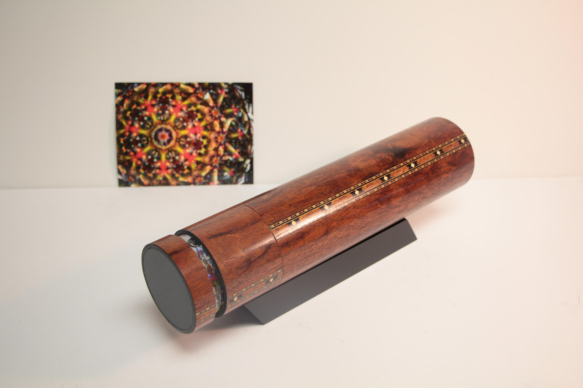 Mark and Carol Reynolds use a variety of woods in their beautiful kaleidoscopes, including natural cherry, bubinga, mahogany, curly, burled and Birdseye maple, padauk, burled walnut, rosewood, and many others as they can get them. veneer, exotic hardwood, front surface mirror systems, and oil filled object chambers.